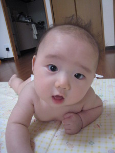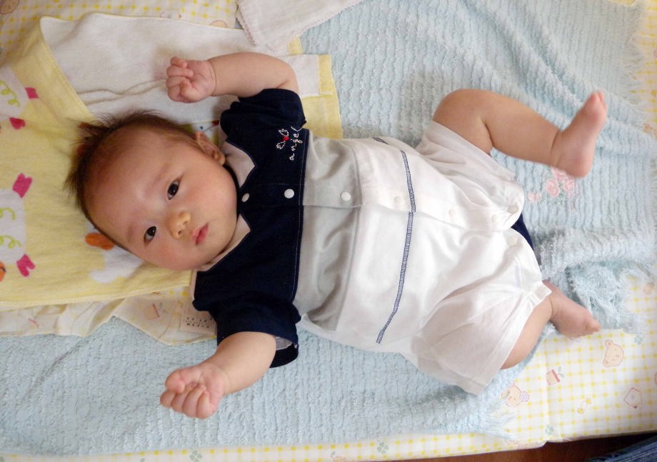 頭が上げられるよ。夏は裸が良いね。(生後4ヶ月)