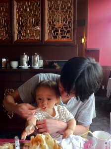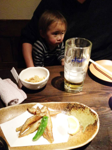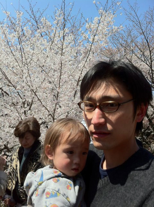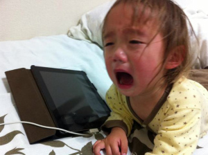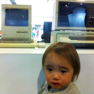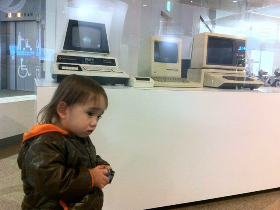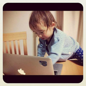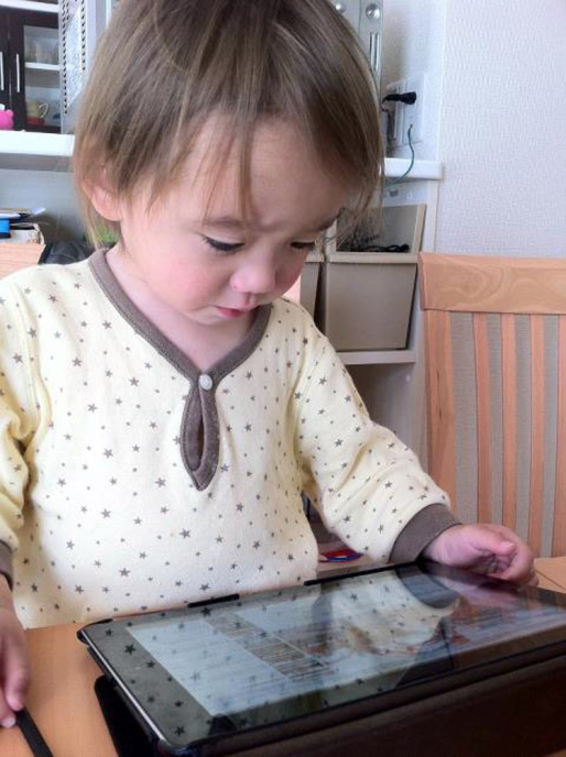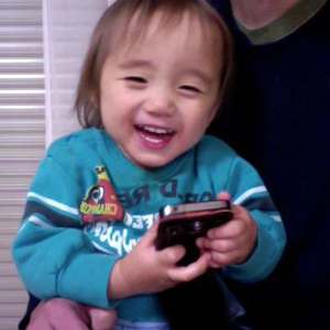 | パパのアイホンを触ってるんだ。爺ちゃんは携帯持ってないんだって。 |