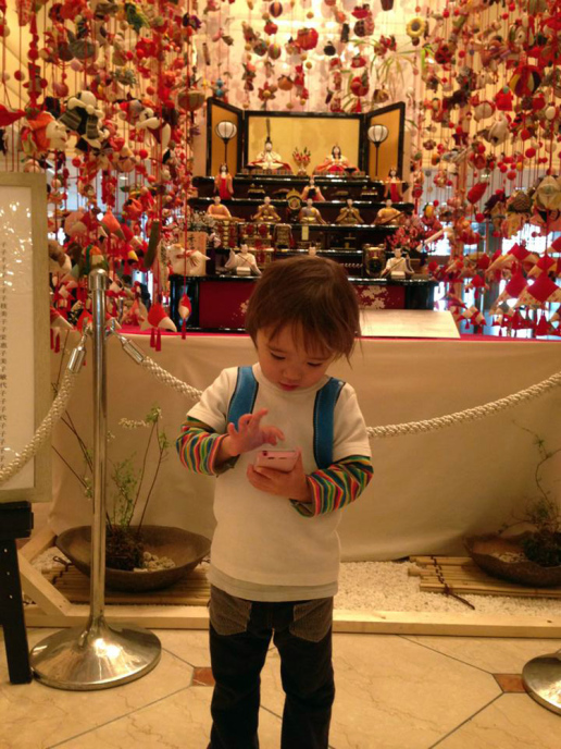 | ホテルに飾ってあった、おひな様の前でゲームしてるんだ。 |