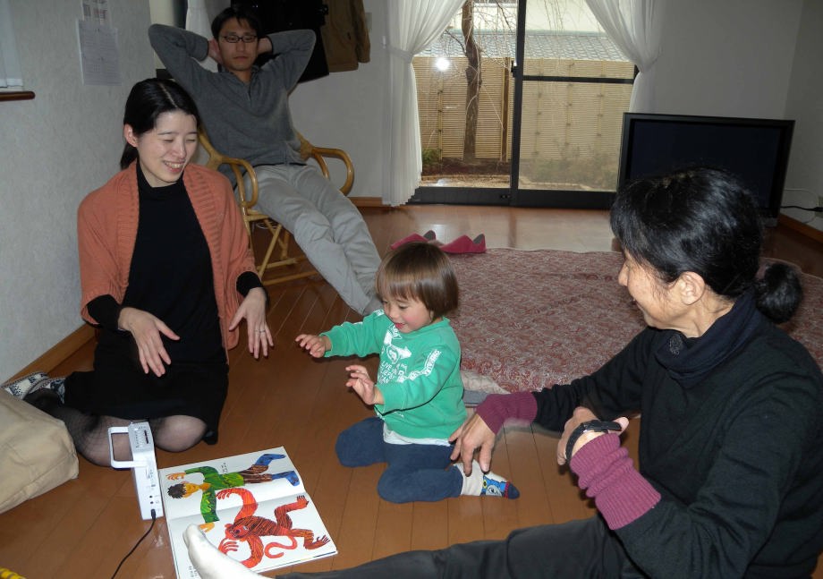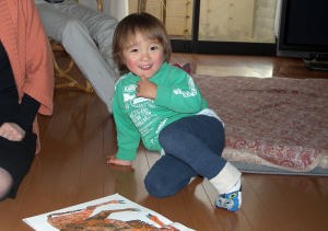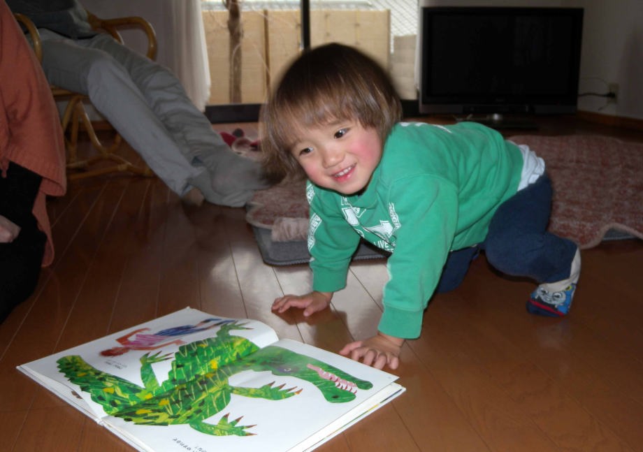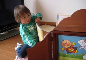 パパママと一緒に爺ちゃんち来たんだ。アンパンマンの紙芝居をさわったよ。