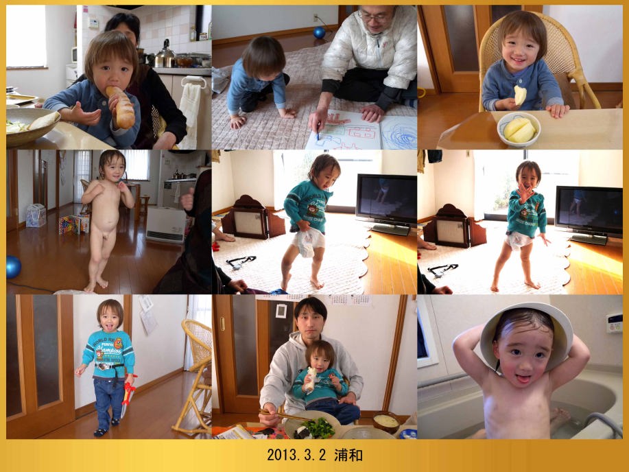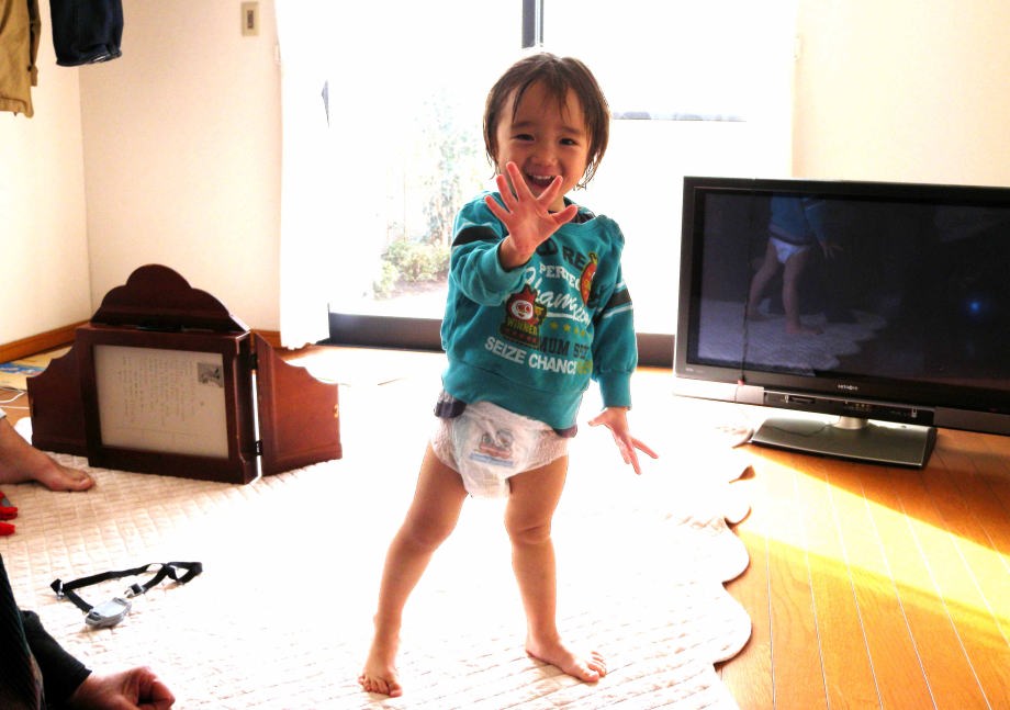 爺ちゃん宅に遊びに行ったよ。ママは用事で来られなかったから自分でオムツをはいたんだ。お昼にお風呂に入ったよ。