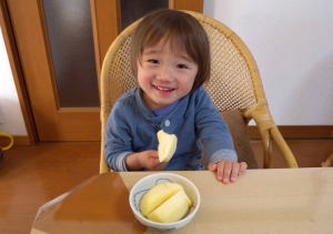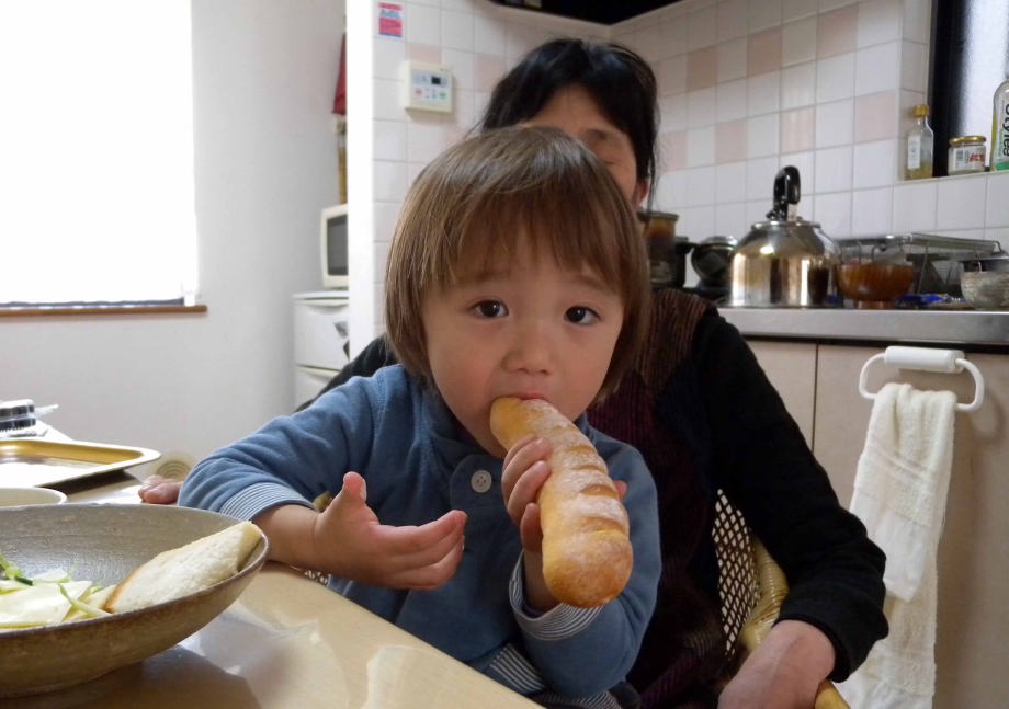 お昼過ぎにパパと一緒に爺ちゃんちに来たよ。おやつのパンを食べてるんだ。