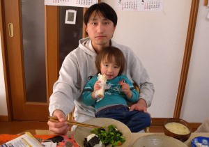 パパが起きて来て一緒に朝ごはんを食べたよ。