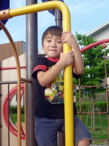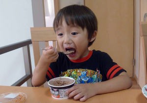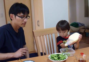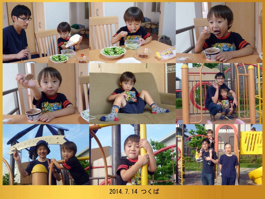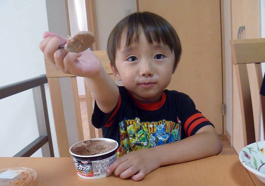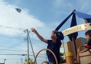 爺ちゃんがプロペラ付の紙飛行機を持って遊びに来たよ。一回だけよく飛んだから皆で大喜びしたんだ。爺ちゃんにアイスクリームを上げたらスゴク喜んだよ。