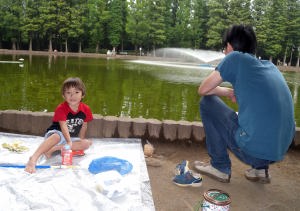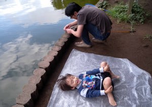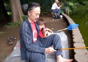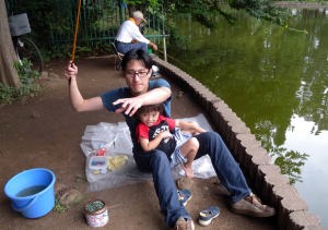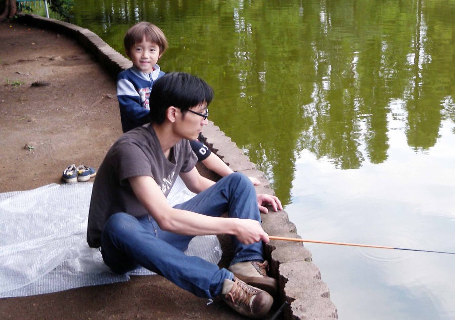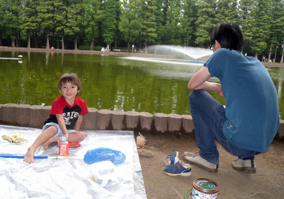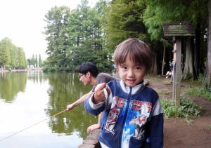 翌日はパパと一緒に魚釣りに行ったよ。2日間でフナ一匹とタナゴが十匹位釣れたよ。僕は風邪気味だったから見てたんだ。魚は爺ちゃん宅で飼うことにして夕方つくばに帰ったんだ。