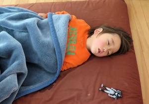 僕は風邪気味で寝んねしてたんだ。仮面ライダーのお土産を貰ったよ。