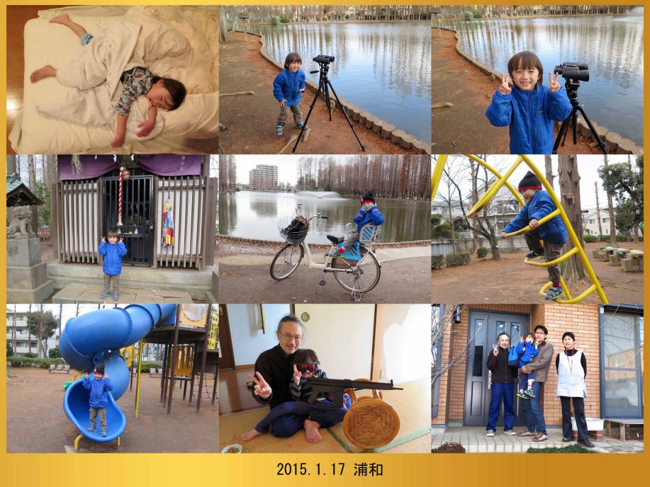 | 1.17 朝までグッスリ寝たんだ。元気になったから別所沼公園にバードウオッチングに行ったよ。神社にお参りして滑り台で遊んだんだ。スワットの真似してエアガンを撃ったよ。夕方パパが迎えに来たんだ。僕はインフルエンザにかかってたんだって。 |