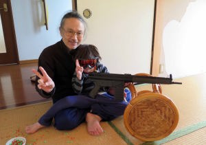 | 爺ちゃんと鉄砲撃って遊んだよ。目に当たると危ないからゴーグルしたんだ。 |