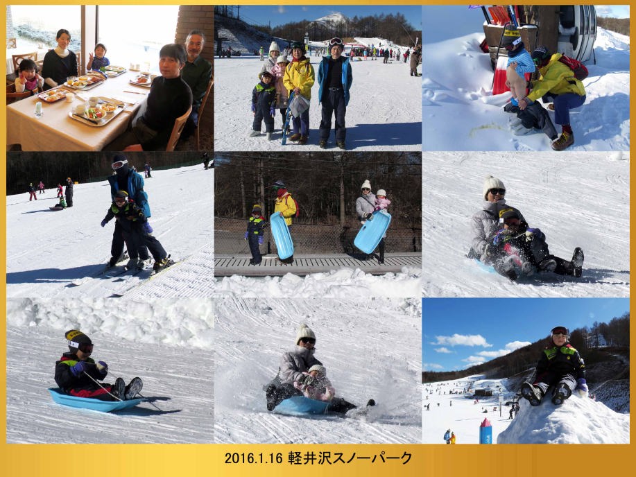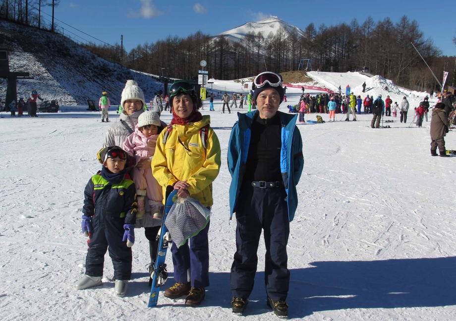 | ホテルのそばのスキー場は雪が沢山あったよ。浅間山がよく見えたんだ。午前中はスキーとソリで遊んだよ。 |