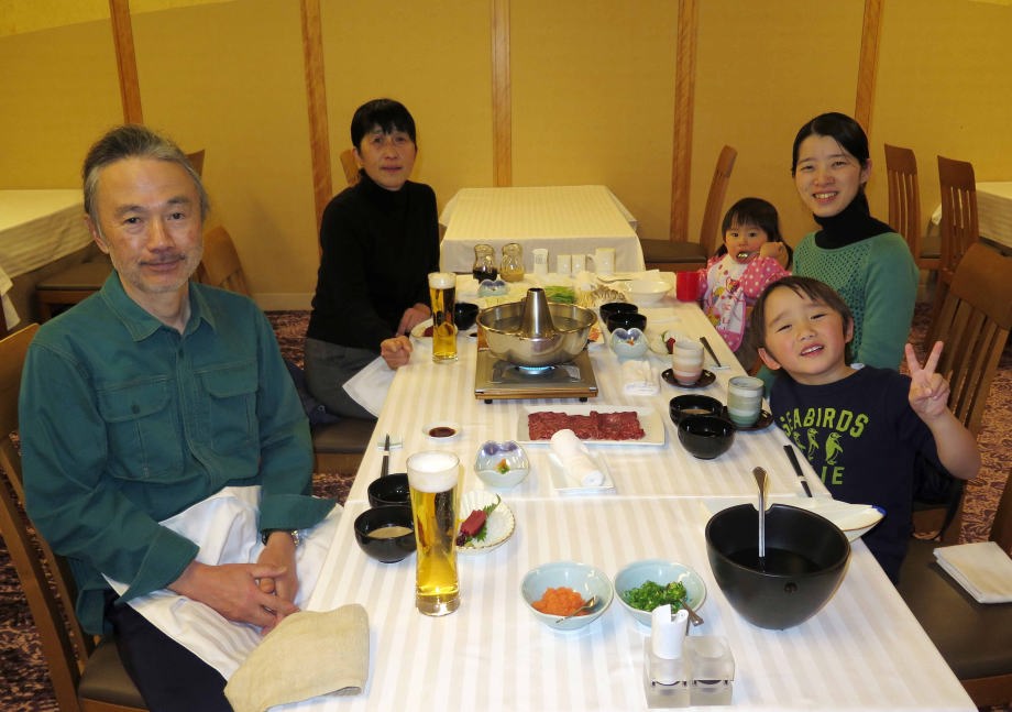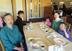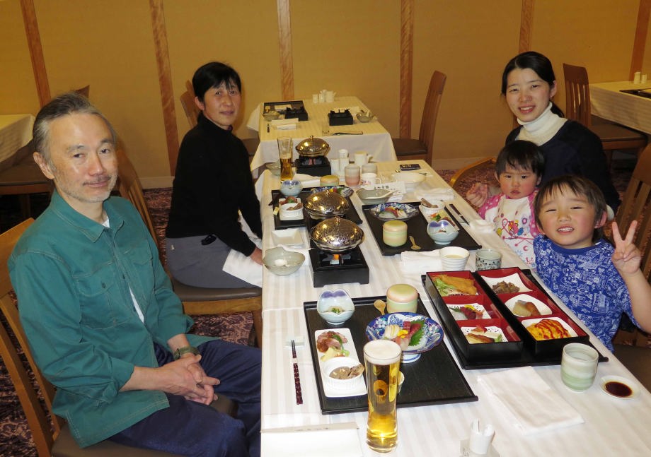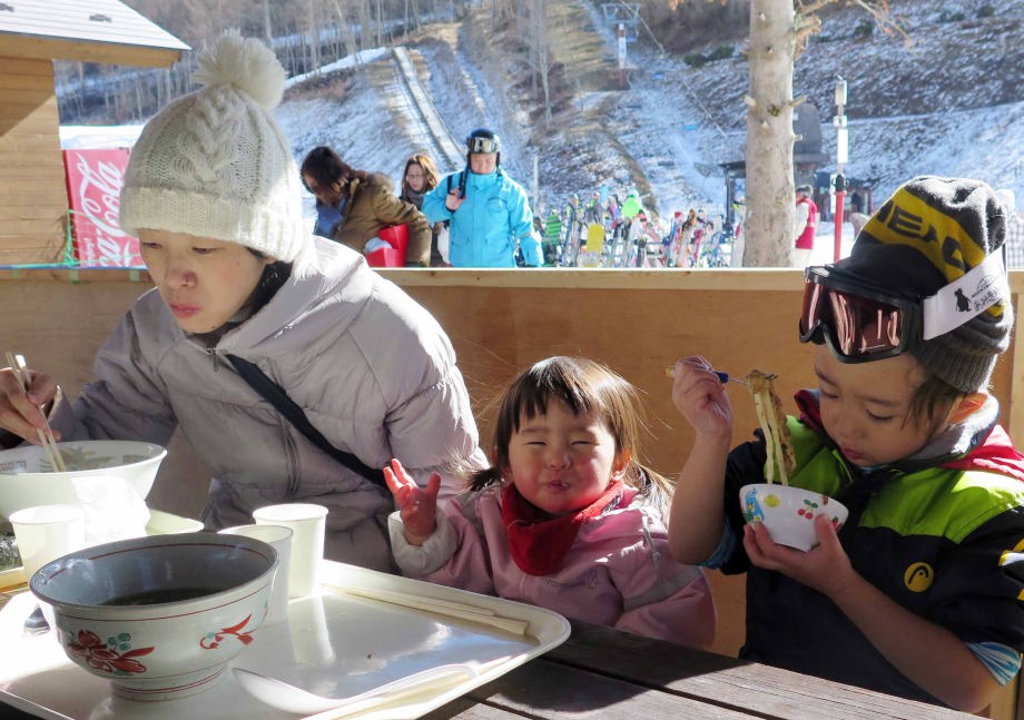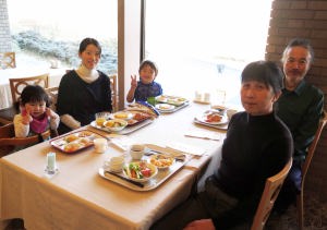 | お昼ごはんを食べてから夕方まで遊んだよ。爺ちゃんと一緒にリフトに乗って山頂から滑ったんだ。長いコースで面白かったよ。 |