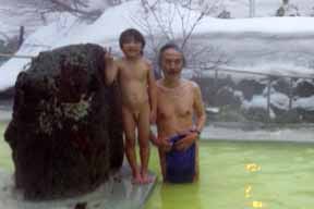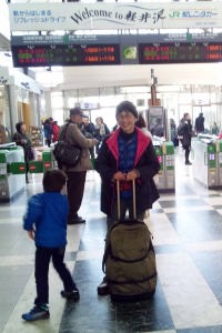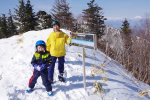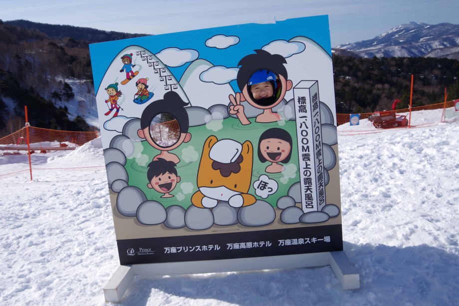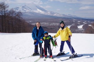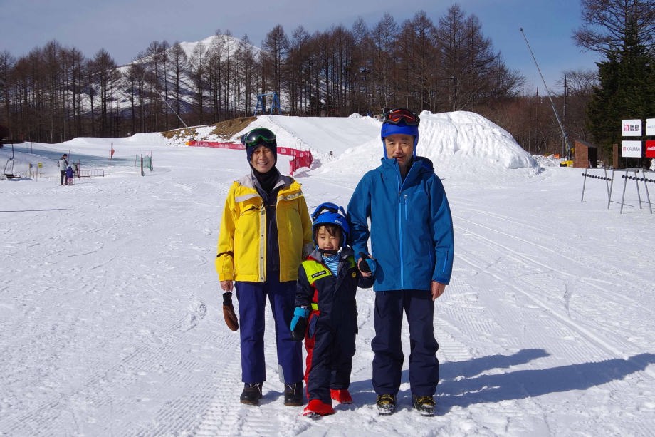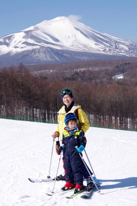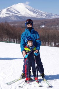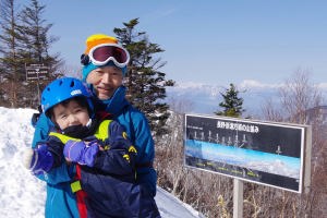 | 軽井沢スノーパークで並んで撮ったんだ。後ろに見えるのが浅間山だよ。 |