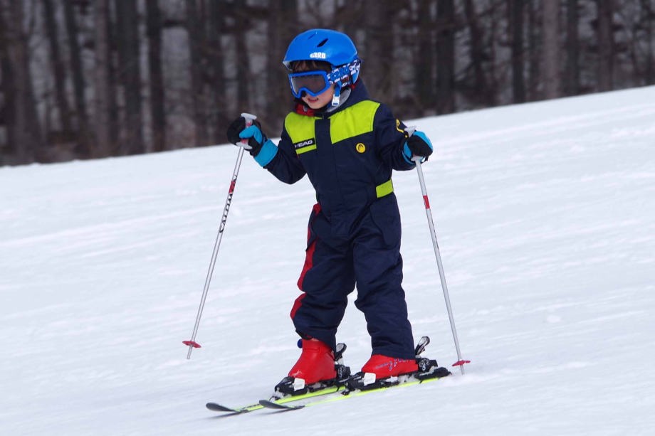 写真をクリックすると僕のビデオが見えるよ。林間コースを下まで一人で滑ったんだ。 |