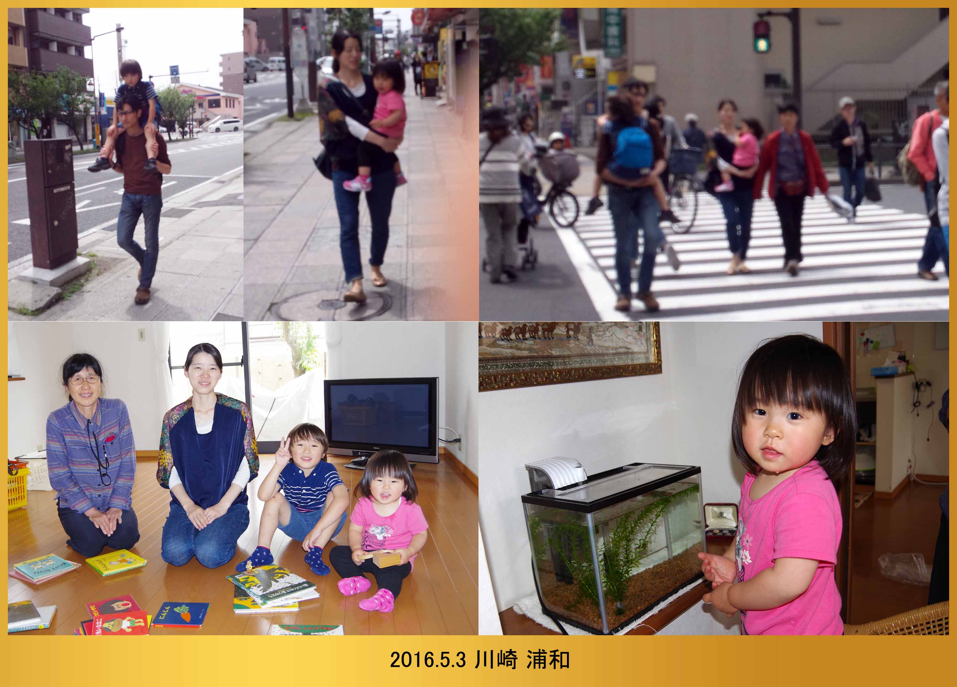 | 5.23 運動会の振替休日だったから爺ちゃんが来たんだ。春ちゃんとパパとママは仕事に行ったよ。婆ちゃんの作ってくれた鳥のから揚げと卵焼きを食べて、爺ちゃんが持って来た鉄砲で遊んだよ。夕方に公園へ行ったら帰って来るママと春ちゃんに会ったよ。ブランコと鉄棒で遊んで蝶チョも捕ったんだ。三人で写真を撮って爺ちゃんは帰ったよ。 |