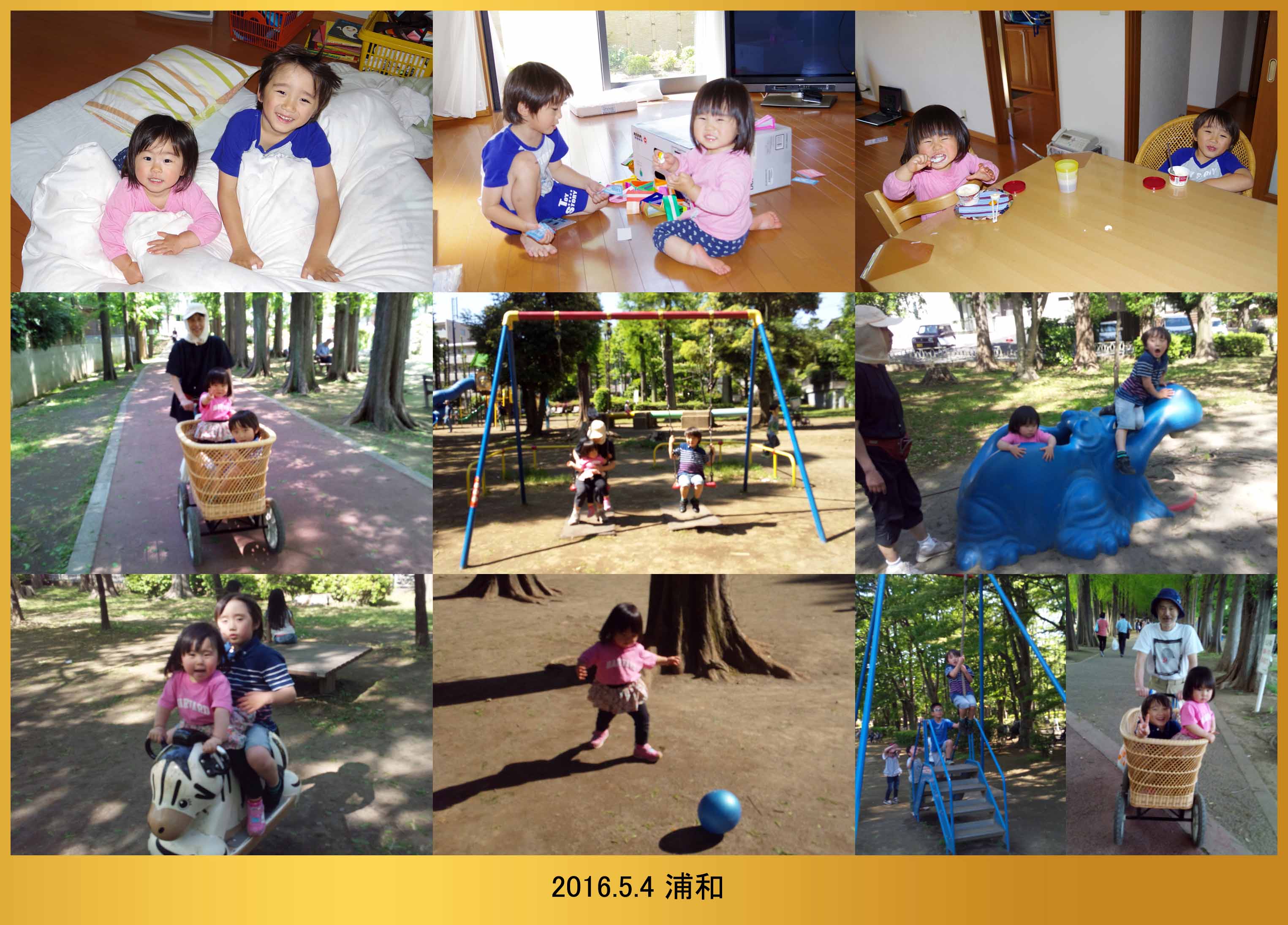 | 5.4 ママは帰ったから春ちゃんと一緒にお泊りしたよ。乳母車で別所沼公園に行って遊んだよ。僕はブランコが一番好きなんだ。一人でターザンロープに乗れるようになったよ。 |