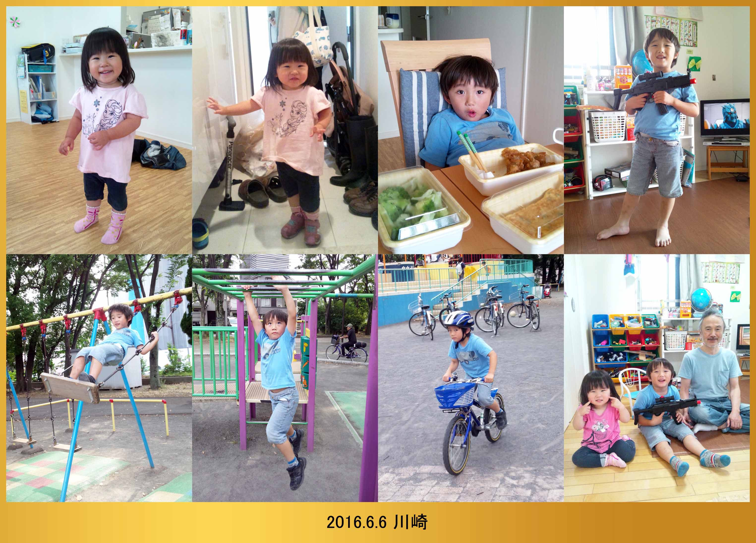 | 6.6 授業参観の振替休日だったから爺ちゃんが来たんだ。春ちゃんは保育園に行ったよ。僕は爺ちゃんとお部屋で遊んだんだ。お昼ご飯に婆ちゃんの作った鳥のから揚げと卵焼きとブロッコリーを食べたよ。公園に行って自転車に乗ったんだ。爺ちゃんに貰った鉄砲を持って写真を撮ったよ。 |