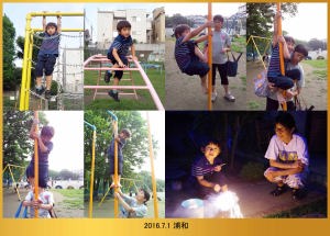 | 5.5 近所の小学校で遊んだよ。逆上がりができるようになったんだ。みんなで写真を撮ってから僕んちに帰ったんだ。 |