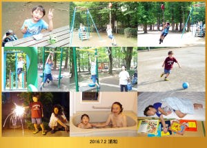 | 7.2 別所沼公園でドローンを飛ばしたよ。ターザンロープに立ち乗り出来たんだ。沢山遊んでから花火をしたよ。お風呂に入って絵本を読んで貰って寝んねしたんだ。 |