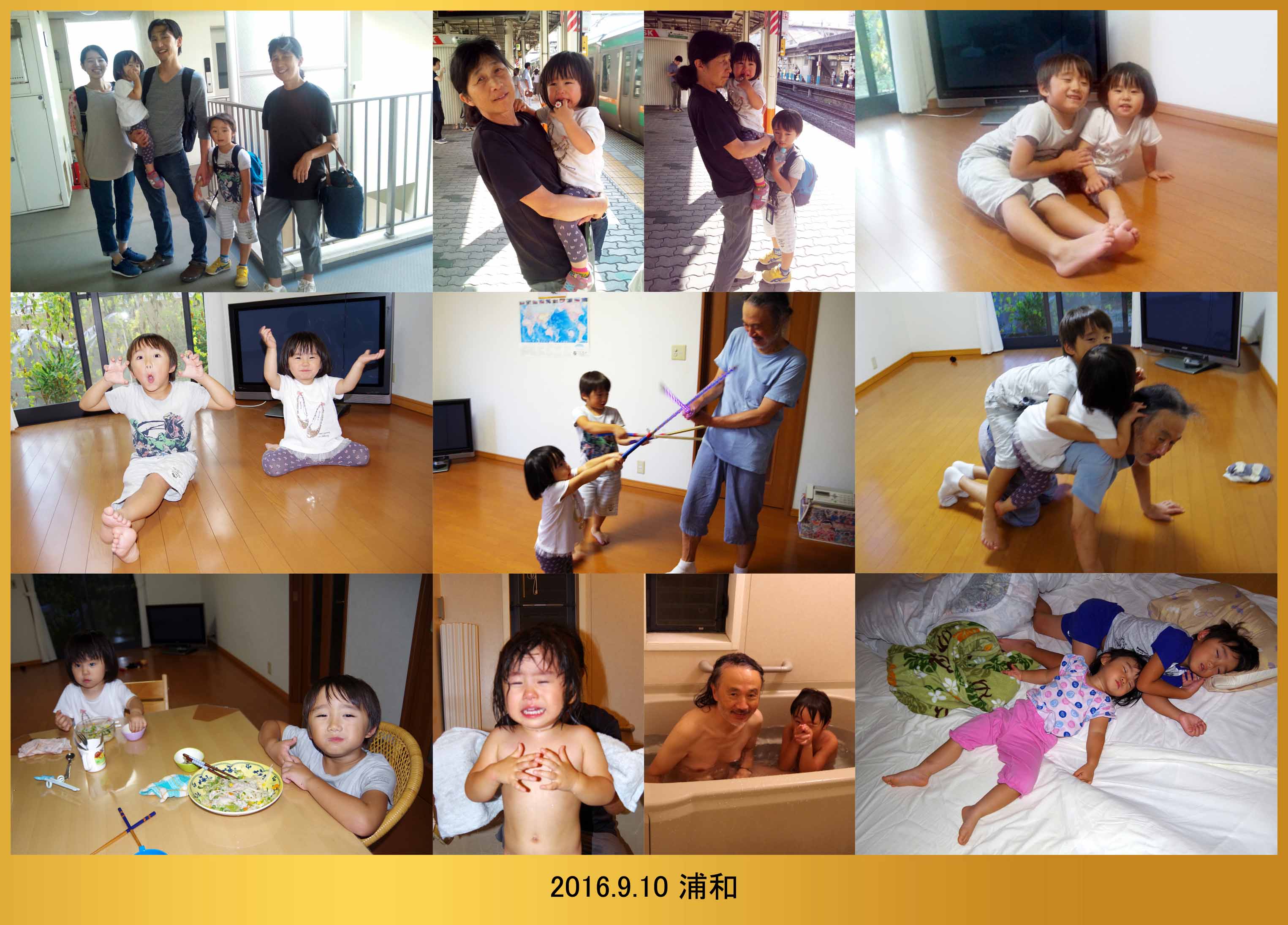| 9.10 パパとママが忙しかったから爺ちゃんちに行ったんだ。ハルちゃんはヤダって泣いたけど浦和に着いたら泣き止んだよ。チャンバラとお馬さんゴッコして遊んだんだ。夕ご飯を食べてお風呂に入ったよ。ハルちゃんはお風呂が熱いって泣いたんだ。ハルちゃんと一緒に寝んねしたよ。 |