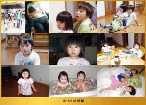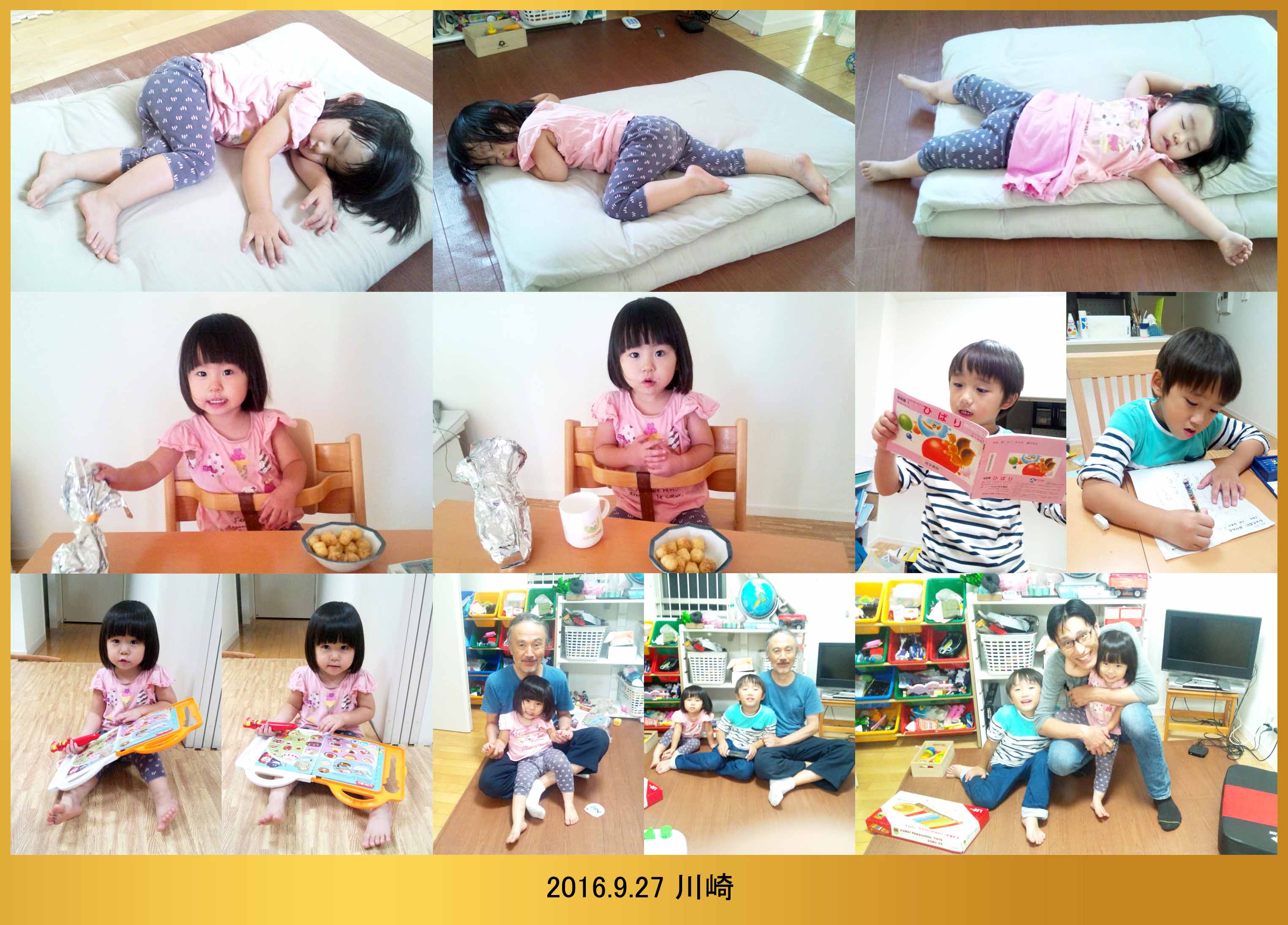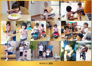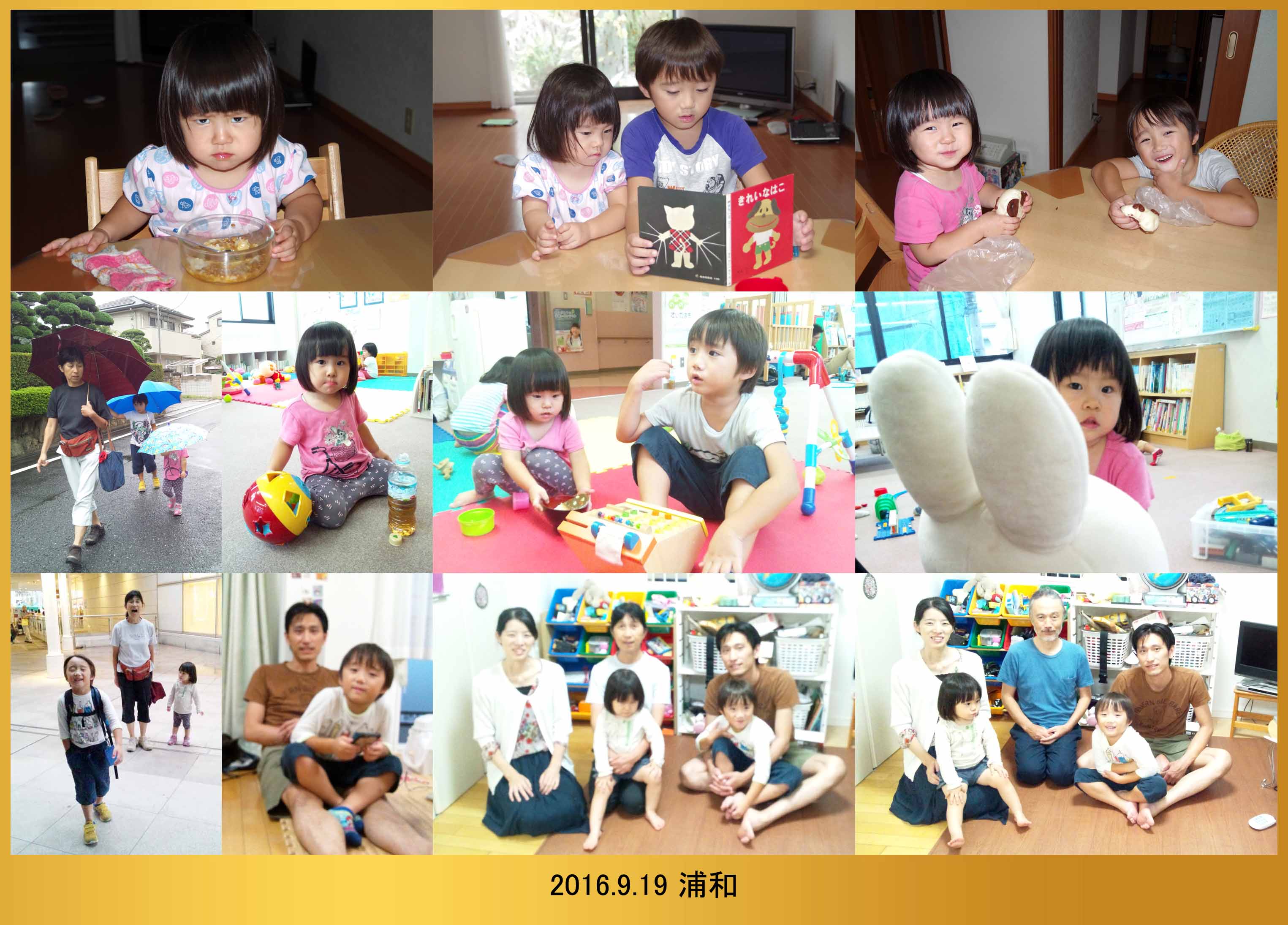 | 9.19 ハルちゃんは寝起きが悪かったんだ。僕が本を読んでお昼にパンダパンを食べたら機嫌が直ったよ。雨が降ってたから児童館で遊んだんだ。夕方に川崎へ帰って皆で写真を撮ってバイバイしたよ。 |