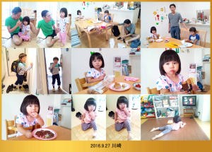 | 9.11 ハルちゃんは卵焼きが大好きだよ。朝ごはんを食べて爺ちゃんと遊んだんだ。それから近所の児童館に行って2人で沢山遊んだよ。ハルちゃんは歩くのが大好きなんだ。夕方に川崎へ帰ったら駅でパパが待っててくれたよ。 |
