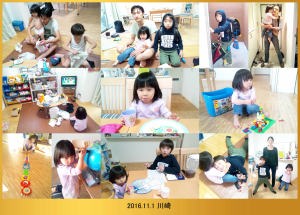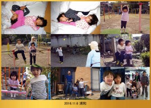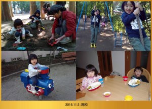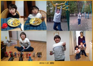 | 11.6 今朝は遅くまで寝てたよ。今日は近所の小学校に遊びに行ったんだ。沢山遊んでお昼過ぎに川崎に帰ったよ。ママが三時に駅に迎えに来てくれたんだ。 |