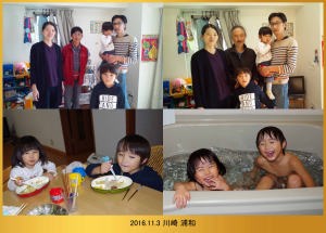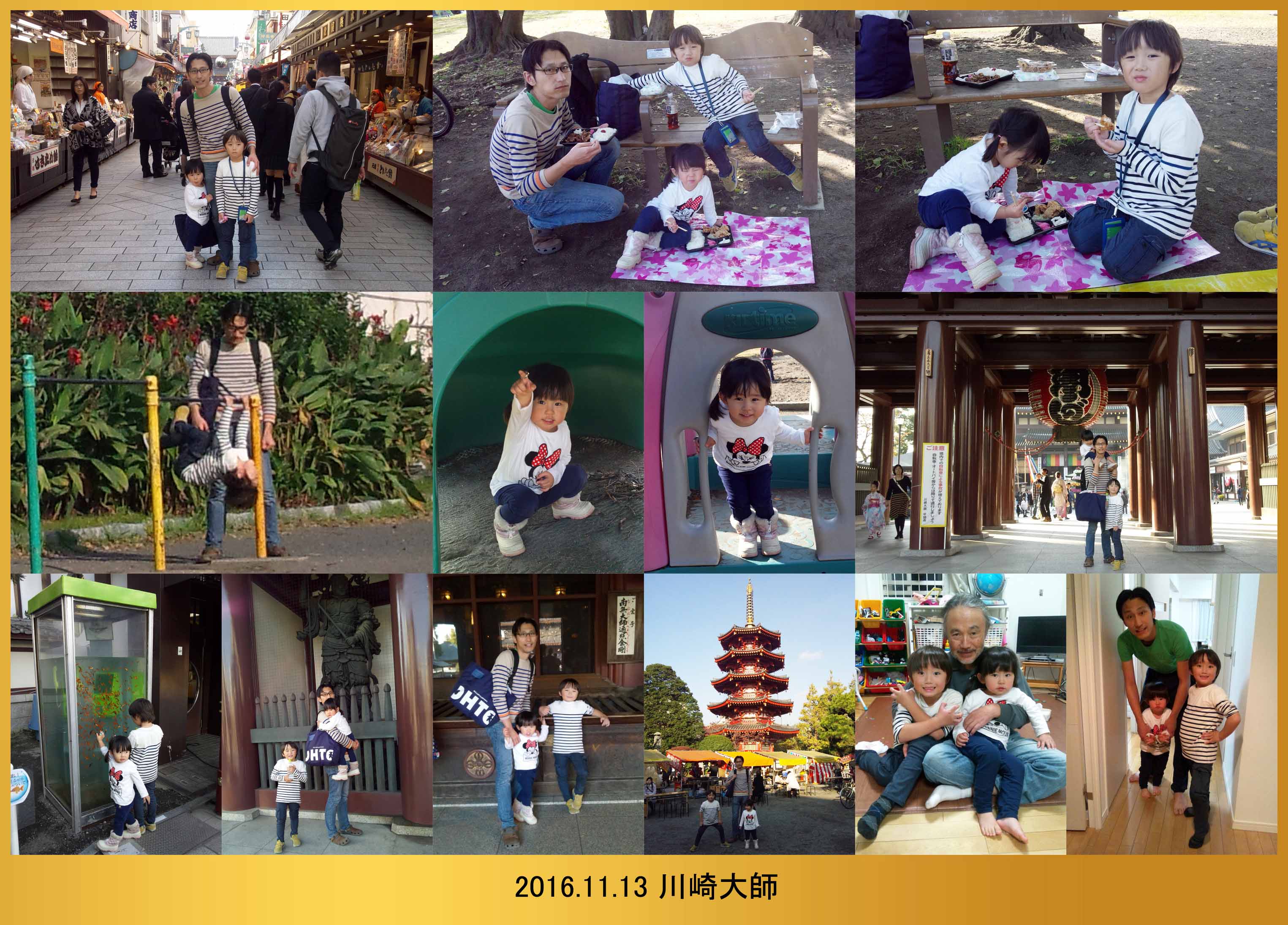 | 11.13 川崎大師に行ったよ。お昼に名物の鳥のから揚げ弁当を食べたんだ。パパと鉄棒で逆上がりの練習をしたよ。ハルちゃんは爺ちゃんと遊んだんだ。神社にお参りしたよ。電話ボックスの中に金魚が泳いでたんだ。お参りして家に帰って爺ちゃんとバイバイしたよ。 |