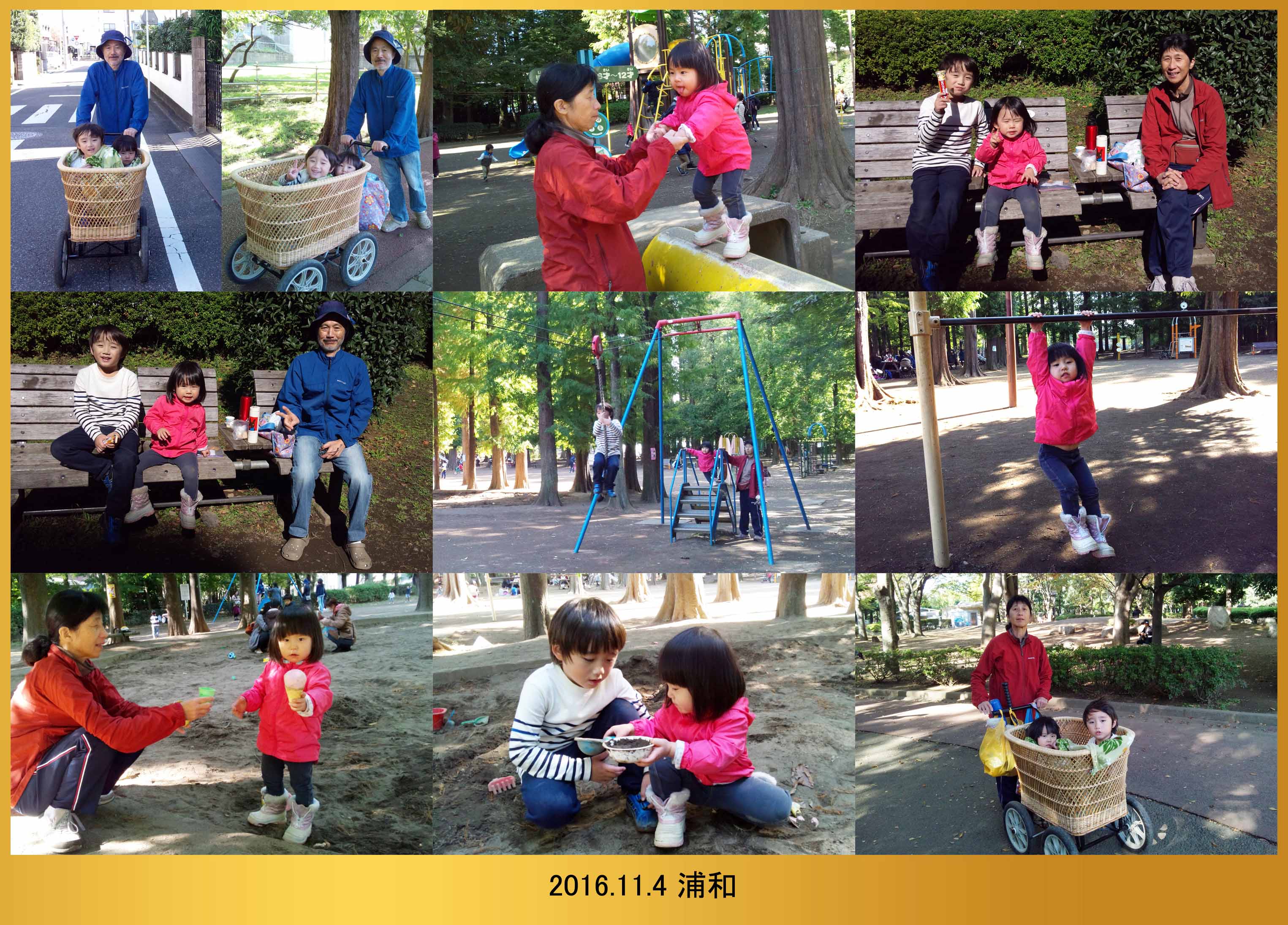 | 11.4 乳母車に乗って別所沼公園に行ったよ。沢山遊んで乳母車で帰って晩ご飯をたべたんだ。ハルちゃんとお風呂に入って寝んねしたよ。 |
