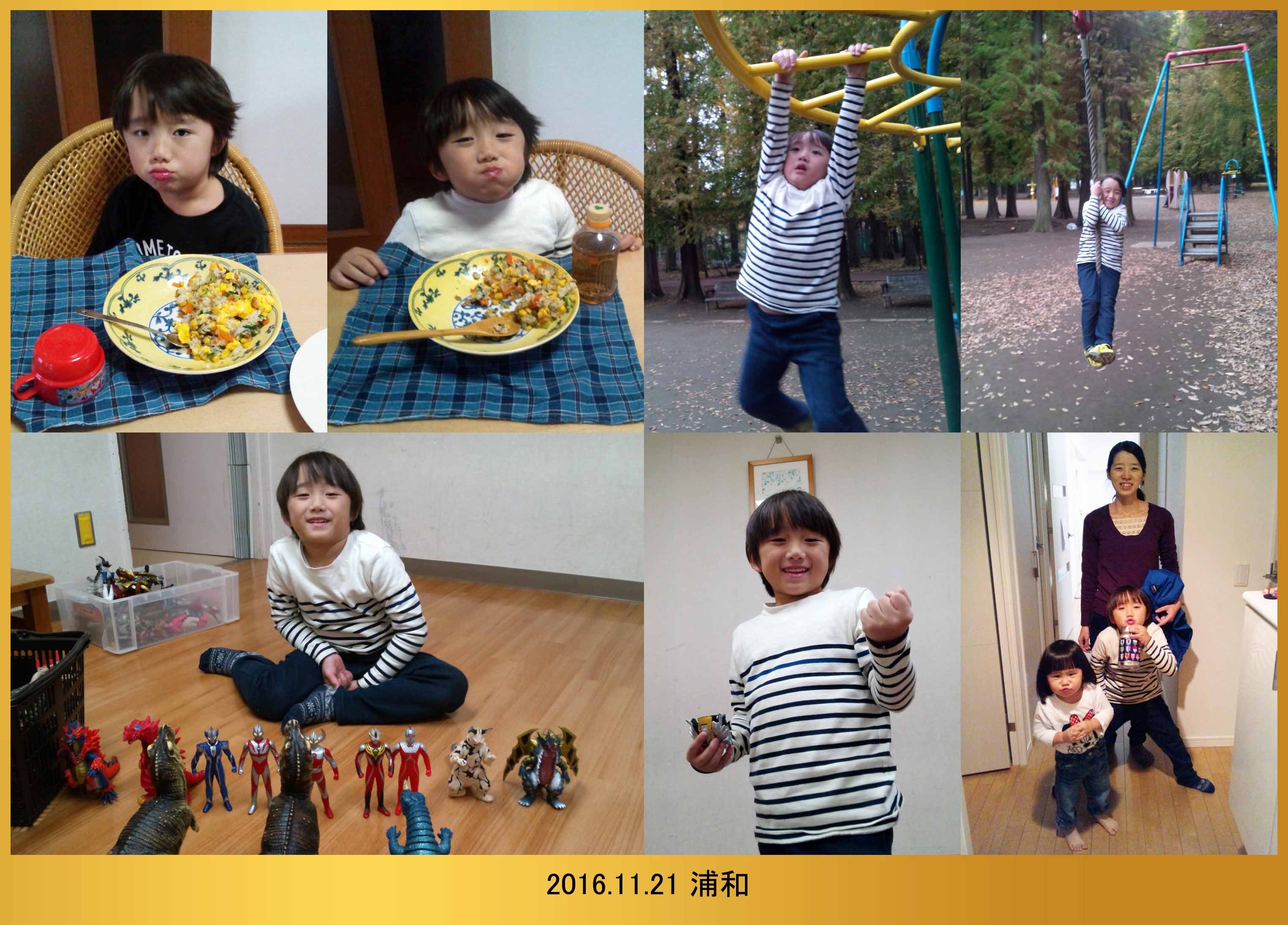 | 11.21 婆ちゃんは仕事に行ったから爺ちゃんと朝ご飯を食べたよ。お昼もカレーを食べて別所沼公園で遊んだんだ。児童館にも行ってウルトラマンで遊んでガッツポーズしたよ。雨が降って来たから急いで川崎に帰ったんだ。六時にママとハルちゃんが待ってたよ。 |