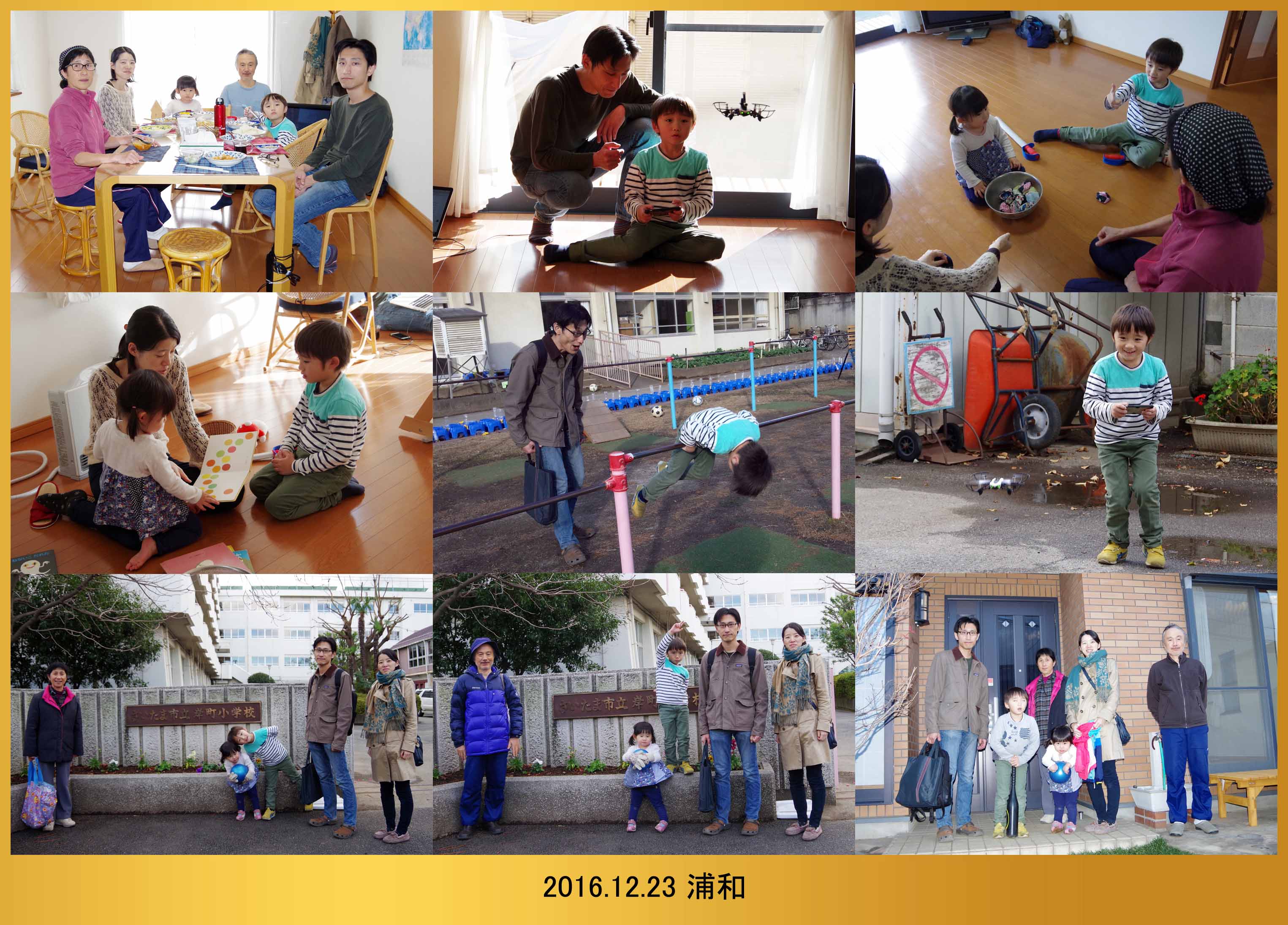 | 12.23 年末に爺ちゃんちに行ったんだ。パパに買って貰ったドローンを飛ばしたよ。お手玉したり本を読んでもらったんだ。近所の小学校で逆上がりが出来たよ。ドローンも飛ばしたんだ。皆で写真を撮って僕んちに帰ったんだ。 |