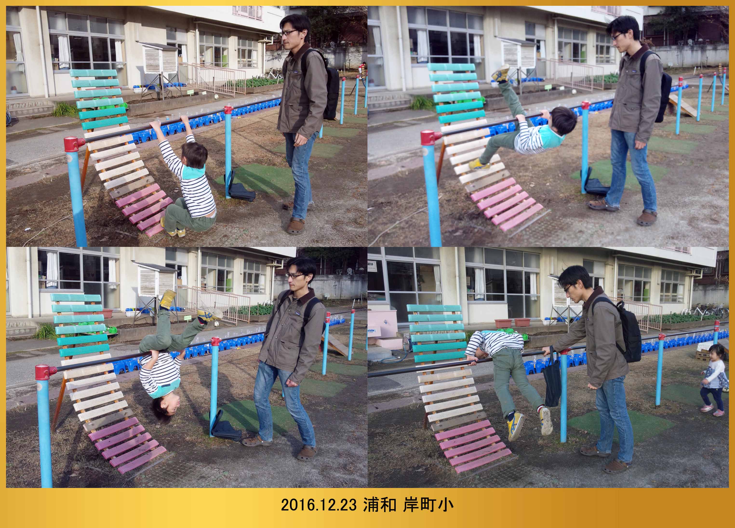 | 12.23 小学校の逆上がり練習用鉄棒でパパに特訓して貰ったんだ。そしたら普通の鉄棒で一回だけだけど逆上がりが出来たよ。来年も頑張るんだ。 |