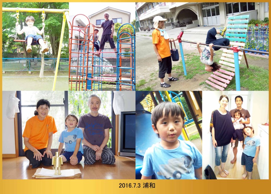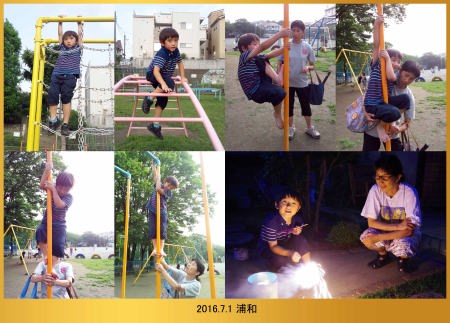 16.7.1 今日は川崎県民の日でお休みだったから爺ちゃんちに来たよ。運動場で婆ちゃんに上り棒を教えて貰ったんだ。夜は花火を160本も燃やして遊んだんよ。