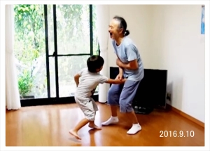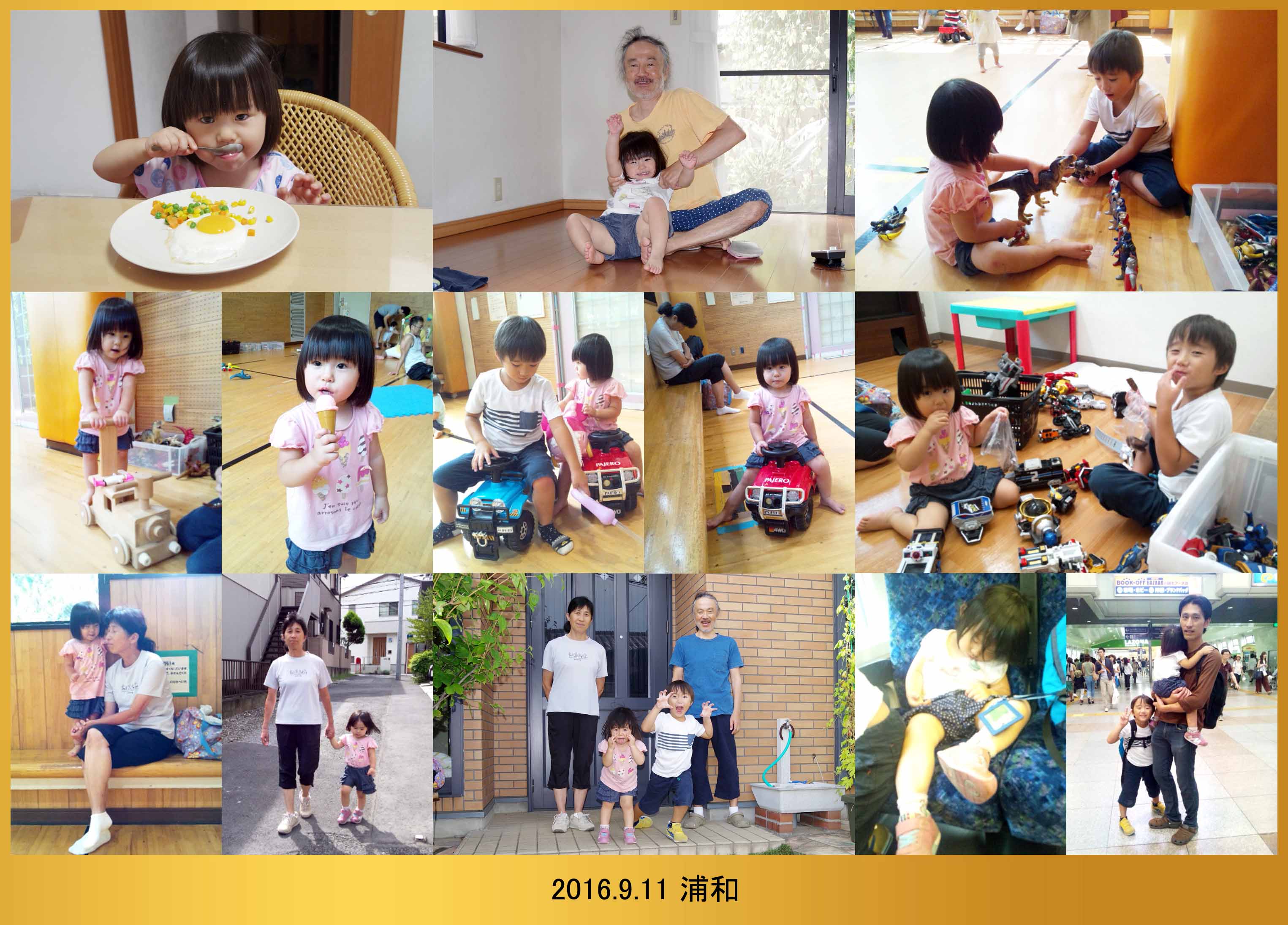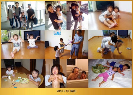 | 16.9.10 パパとママが忙しかったから爺ちゃんちに行ったんだ。ハルちゃんはヤダって泣いたけど浦和に着いたら泣き止んだよ。チャンバラとお馬さんゴッコして遊んだんだ。夕ご飯を食べてお風呂に入ったよ。ハルちゃんはお風呂が熱いって泣いたんだ。ハルちゃんと一緒に寝んねしたよ。 |