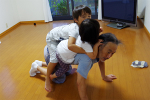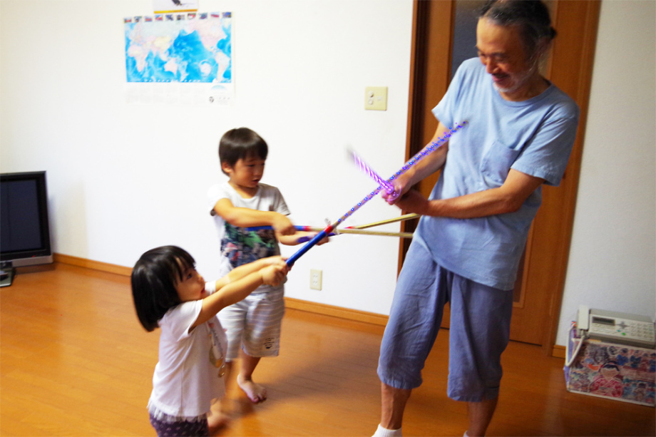 爺ちゃんちに着いて「戦いゴッコ」したんだ。 |