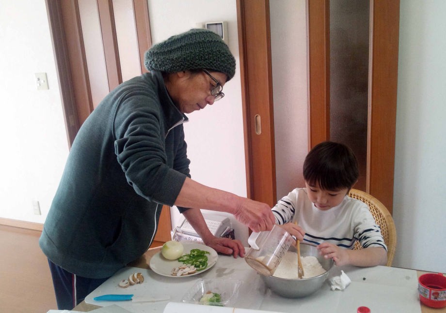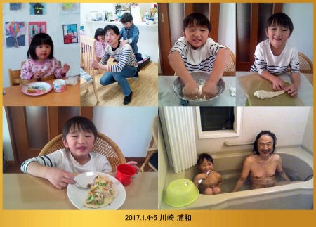 17.1.4~5 スキーに行くからパパに肩もみしてバイバイしたよ。ハルちゃんはママと後から来るんだ。爺ちゃんちでパイを作って食べたよ。お風呂で歯を磨いて寝んねしたんだ。