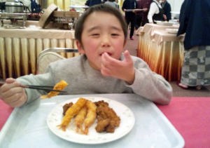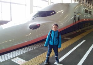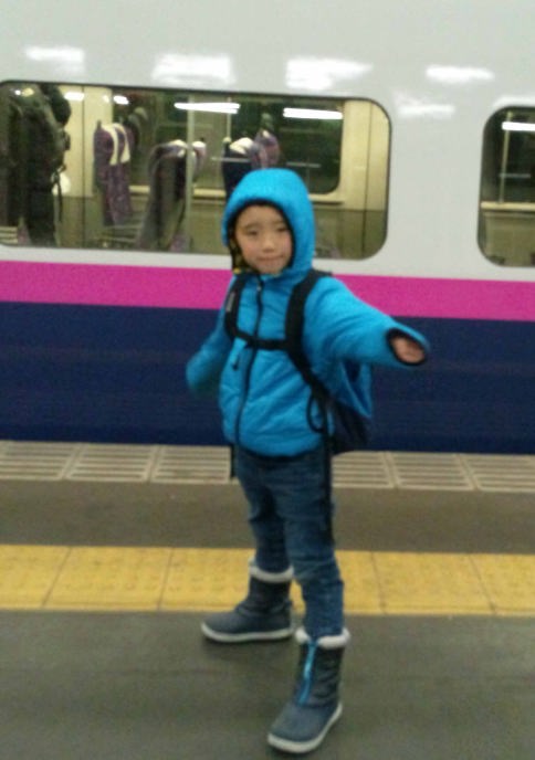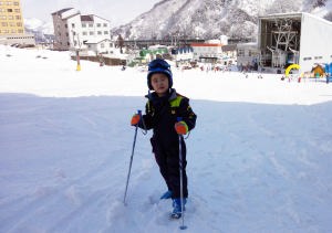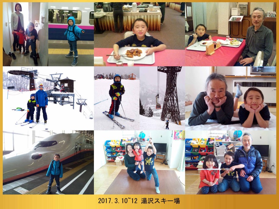 | 17.3.10〜12 爺ちゃんと新幹線に乗ってスキーに行ったよ。スキー場の側にある湯沢東映ホテルに泊まったんだ。朝食も夕食もバイキングだったから鳥のから揚げとソーセージを沢山食べたよ。ゴンドラとリフトに乗って湯沢高原の山頂まで行って爺ちゃんと並んで写真を撮ったんだ。帰りはゴンドラの下を滑って降りたけどスゴク急で怖かったよ。くたびれたからホテルの前にある平らなコースを滑って温泉に入って寝んねしたんだ。次の日は10時の新幹線で川崎に帰ったよ。何時かゴンドラの下をスイスイ滑って降りるんだ。 |