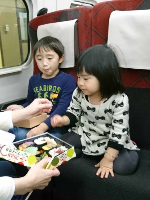 | 1/4 新幹線に乗って「お昼ご飯」を食べてるんだ。 |