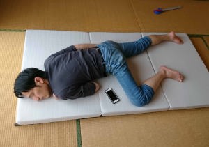タイヤに寝そべって背骨を伸ばしたんだ。
