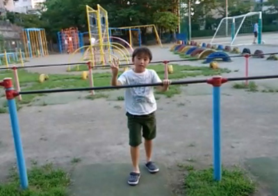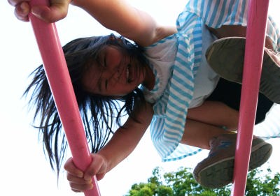太鼓橋の鉄棒を渡ったわ。