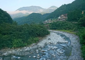 | 8/11 信玄館の窓から見た朝の眺めだよ。中川は手前の上流にあるんだ。 |