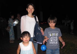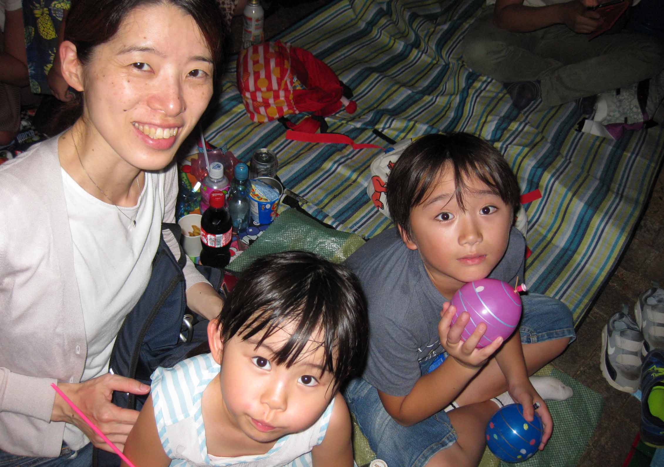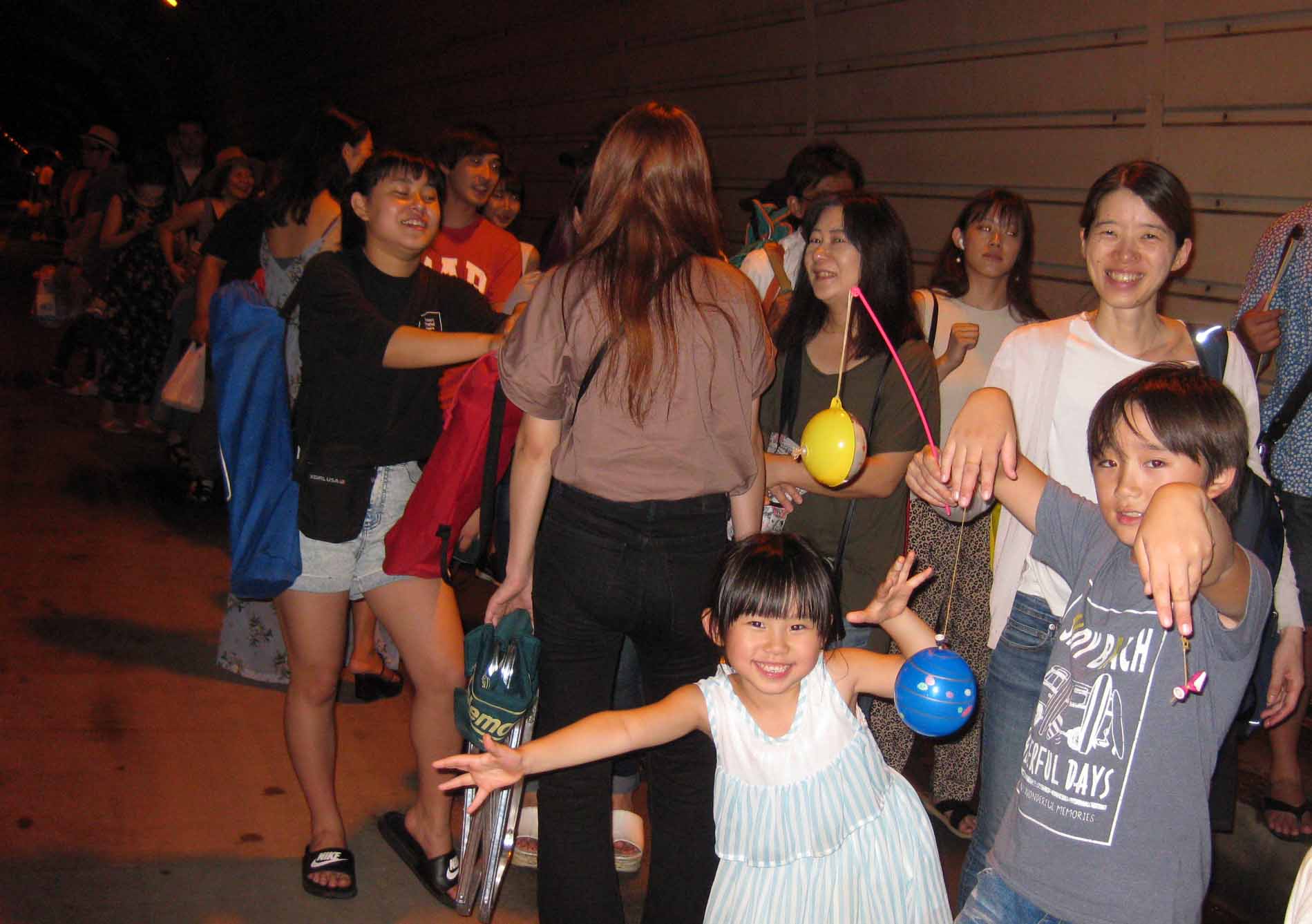| 帰りのバスを待ってるの。一時間も並んだけど花火は面白かったよ。 |