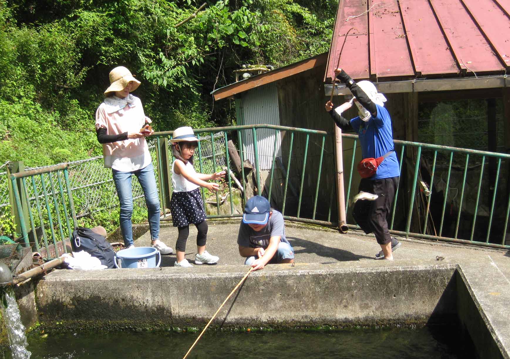 | マス釣りに行ったんだ。最初に僕が釣ったよ。次に婆ちゃんが釣ったんだ。 |