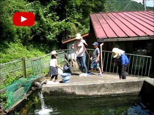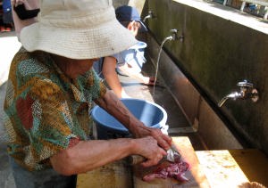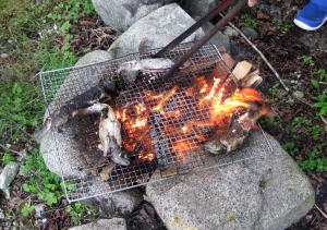 | 釣り場のお婆さんが釣ったマスをさばいてくれたんだ。 |