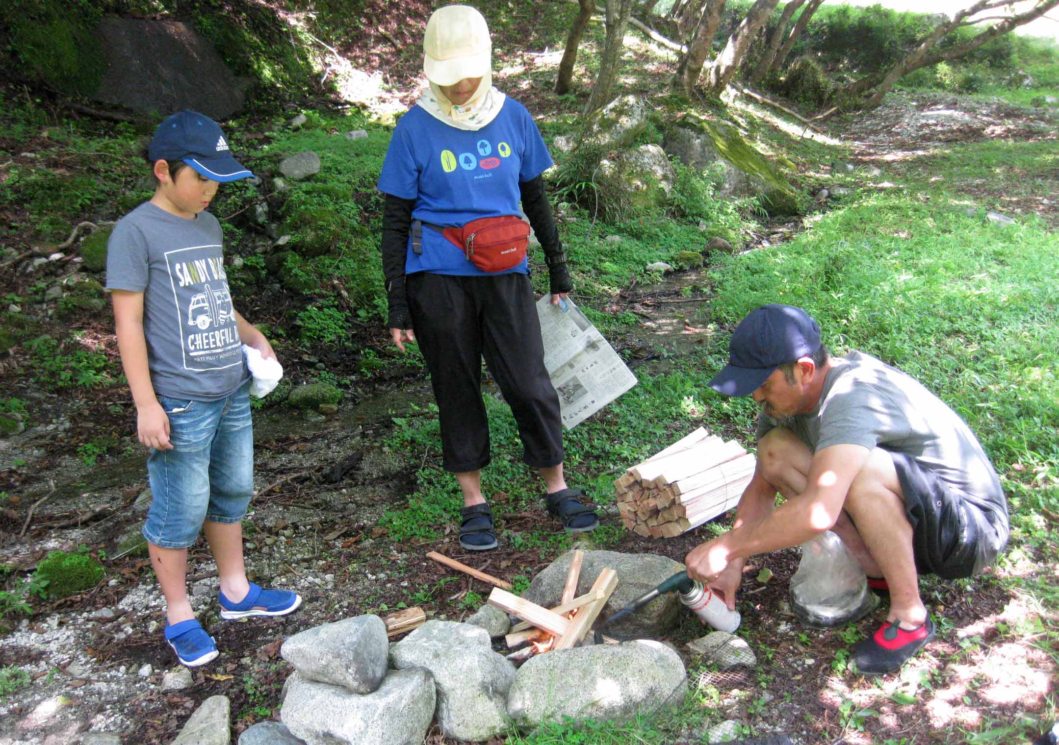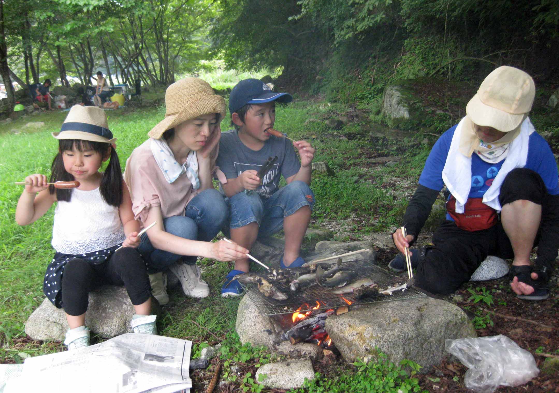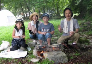 | バーベキュウして食べるんだ。よそのおじさんが火を付けてくれたよ。 |