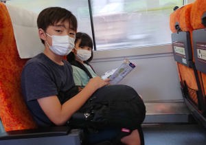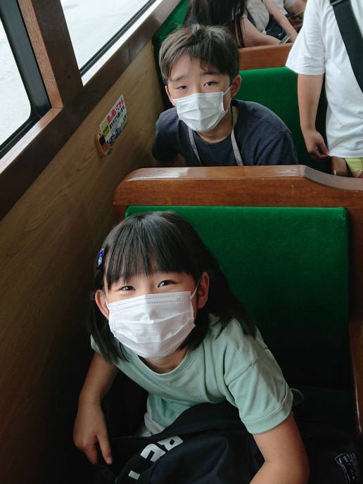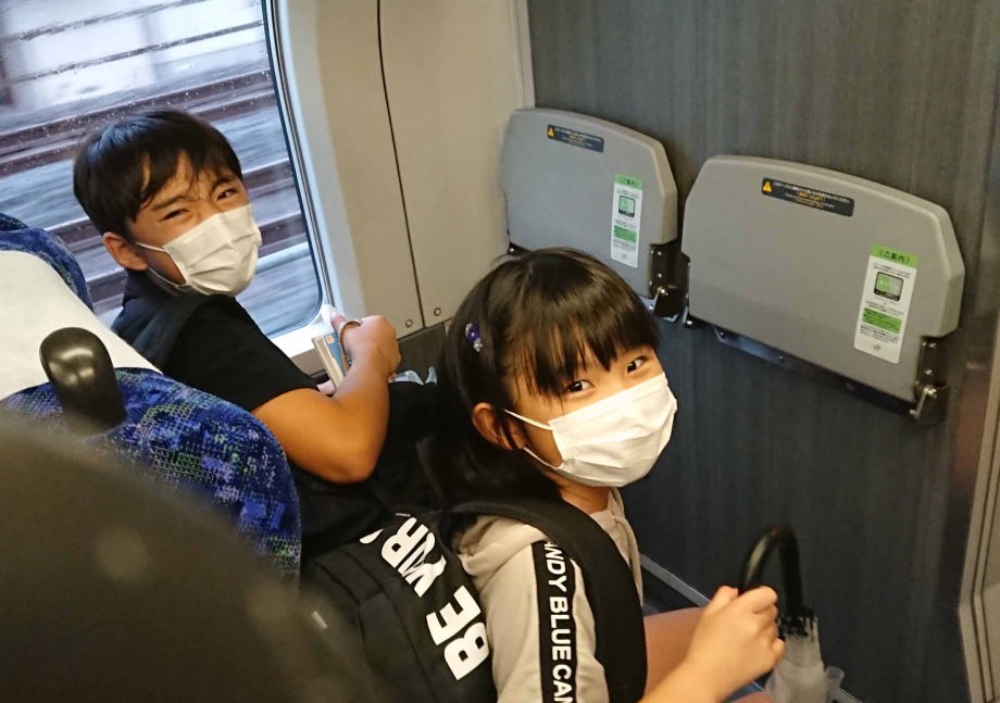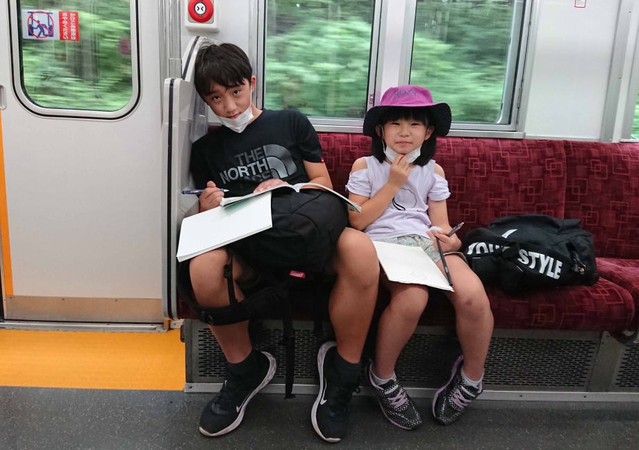 | 電車に乗って宿題をしたよ。爺ちゃんがトイレに行って乗り損ねそうになったんだ。 |