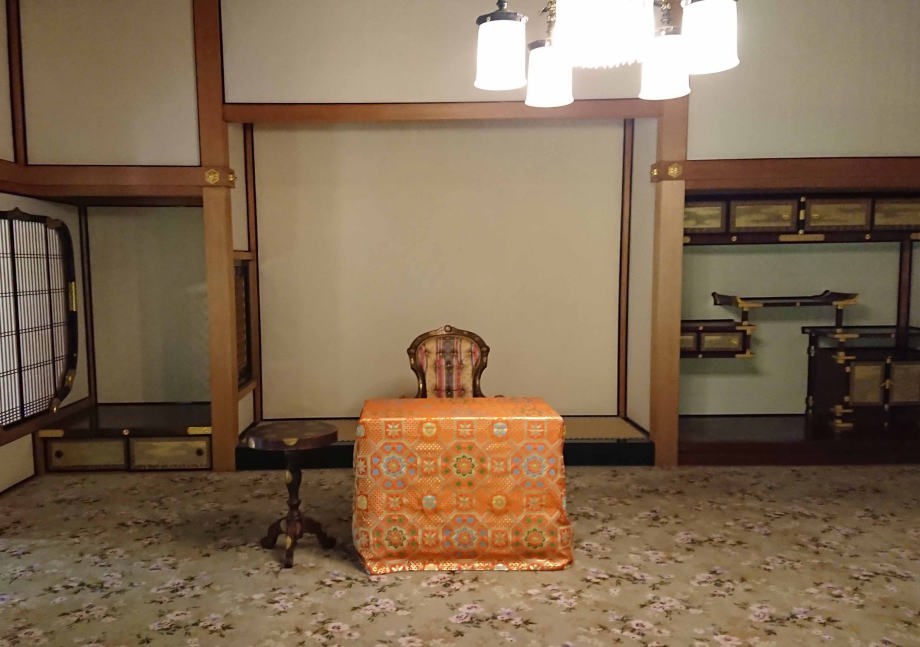 | 「謁見所(えっけんじょ)」は大正天皇が座ってたんだ。和室に絨毯(じゅうたん)が敷いてあったよ。 |
