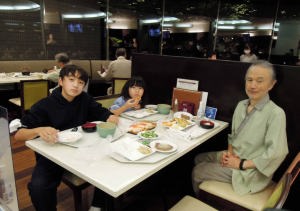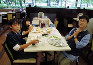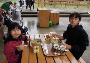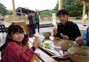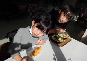 | ロープウエイを降りてうどんを二杯食べたよ。ハルちゃんはお団子を食べたの。 |