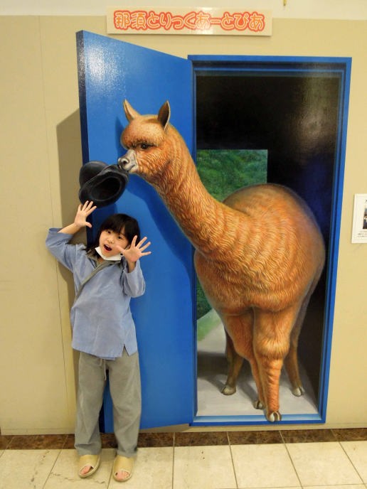 | 廊下に「トリックアート」があったの。本物のアルパカ見たいでしょう。 |