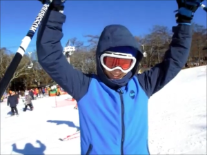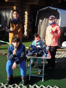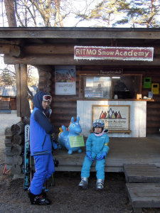 今朝は8時半からスキースクールに入ったの。危ないからヘルメットを被ったわ。