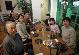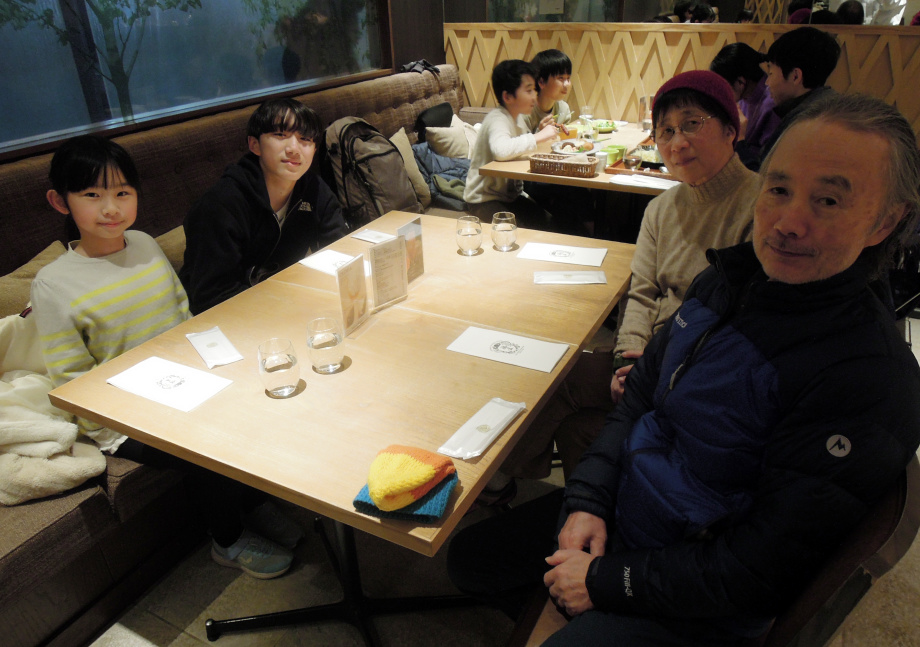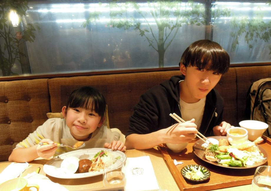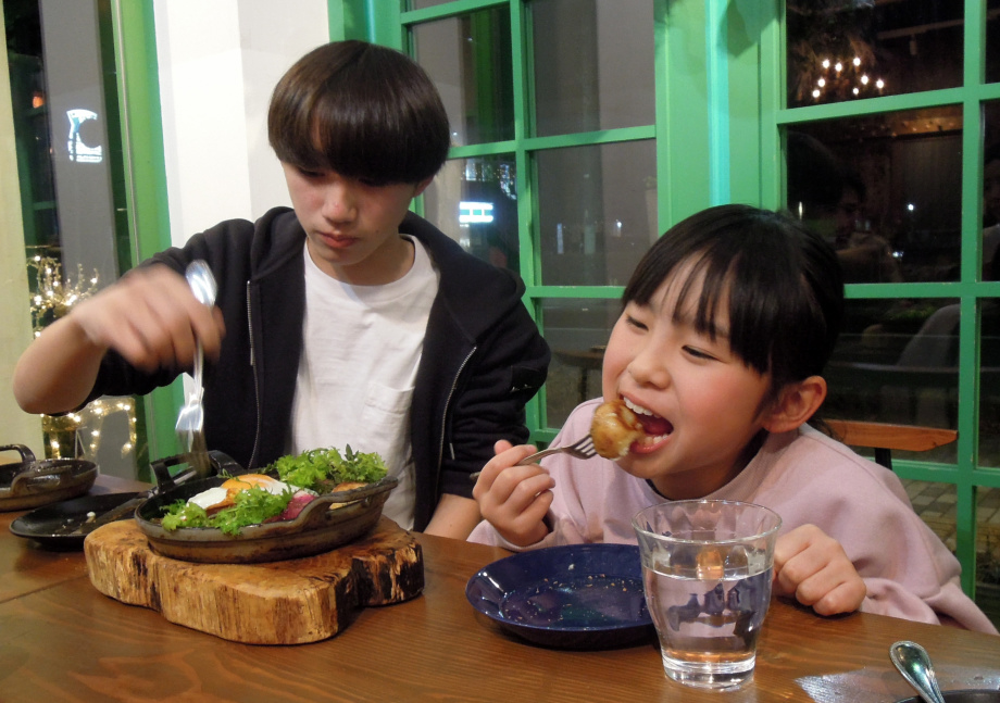晩ご飯は外のレストランで食べたの。満席だったから、パパママは離れた席に座ったの。