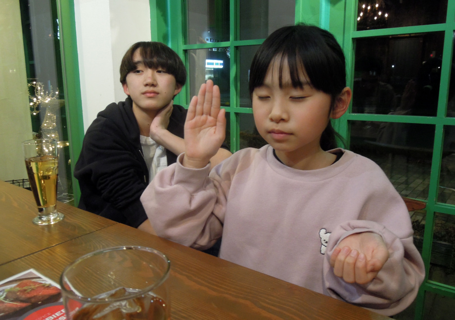 レストランで晩ご飯を食べたの。食前に瞑想したわ。